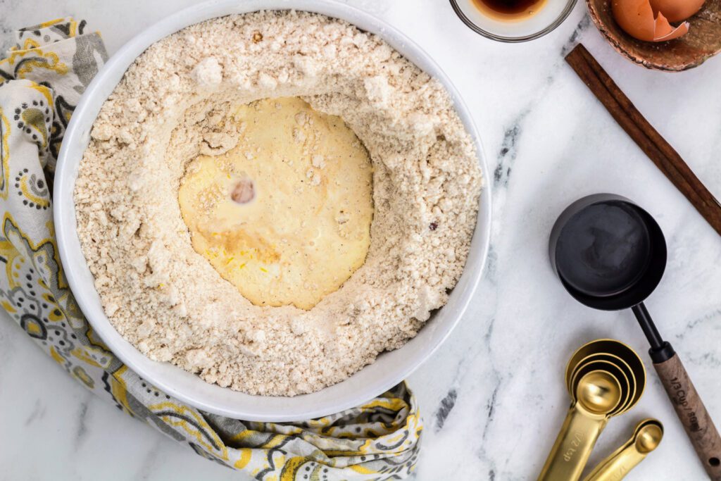 Mix the wet ingredients and zest, add to the well, then toss with the flour mixture until a firm dough forms.