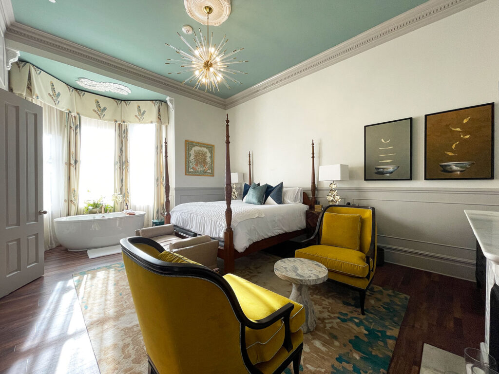 Long before Pinterest, Patty Theodorides had been a collector of images of great design. For 25 years, she filed away interior design tear sheets, fabric swatches, and real estate brochures. When Patty first bought a run-down Victorian mansion in a historic residential neighborhood near downtown Napa, she had no plans to turn it into a boutique inn. She had merely fallen in love with the neighborhood and wanted to restore the home to its former grandeur. It was described in the National Register of Historic Places as “one of Napa’s most successfully executed examples of late 19th-Century residential architecture.” The home had been built in 1891 for a pair of prominent Napa newlyweds. Decades later, it was divided into apartments, fell into disrepair, and suffered further damage in the 2014 earthquake. After purchasing the property in 2016, Patty’s son and daughter urged her to convert the property into a B&B. Drawing upon her vast collection of interior design images and embarking on a painstaking five-year renovation, she and her family opened The George in March of 2021. The new nine-room inn remains true to the building’s historic architectural details while creating gorgeous interiors steeped in modern style and luxury. Highlights include a grand staircase, original inlaid wood floors, elegant modern furnishings, luxurious cloud-like beds, marble baths with heated tile floors, third-floor suites with exposed rafters and skylights, and keyless entry systems. The inn’s speakeasy is slated to open later this year.