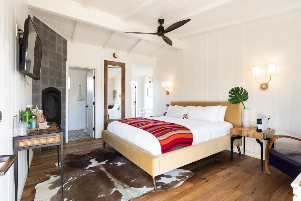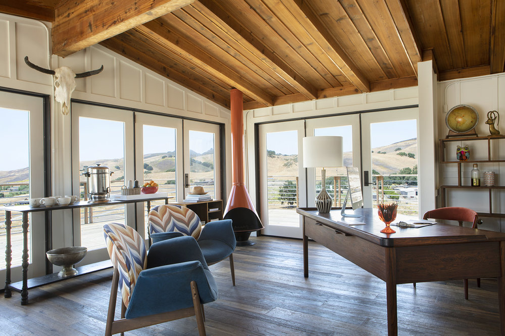 Throughout the hotel, original mid century architecture has been enhanced with a modern rustic aesthetic and luxury trimmings. The guest rooms have undergone a stem to stern renovation and feature hardwood floors, AC/heat, flat panel televisions, down duvets, leather club chairs and marble-clad bathrooms. Many rooms have indoor fireplaces and private patios with stunning wine country views.