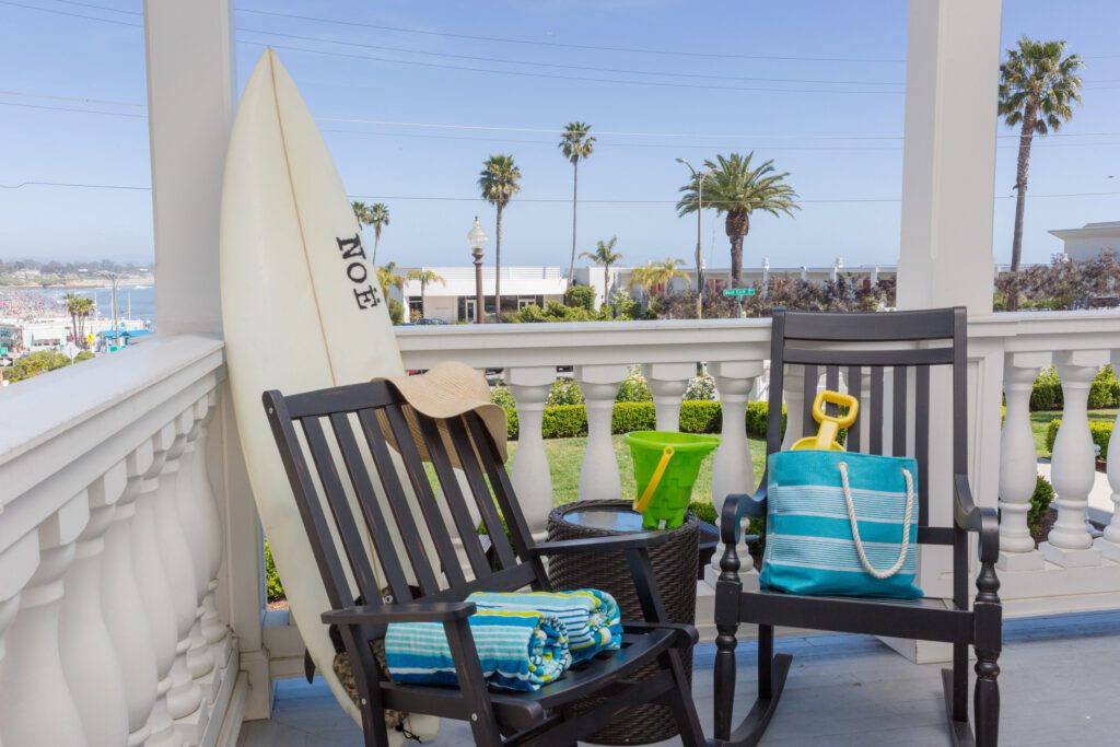 This distinctive Santa Cruz, California bed and breakfast inn is situated on a bluff across from Cowell’s Beach and the famous Santa Cruz Beach and Boardwalk.