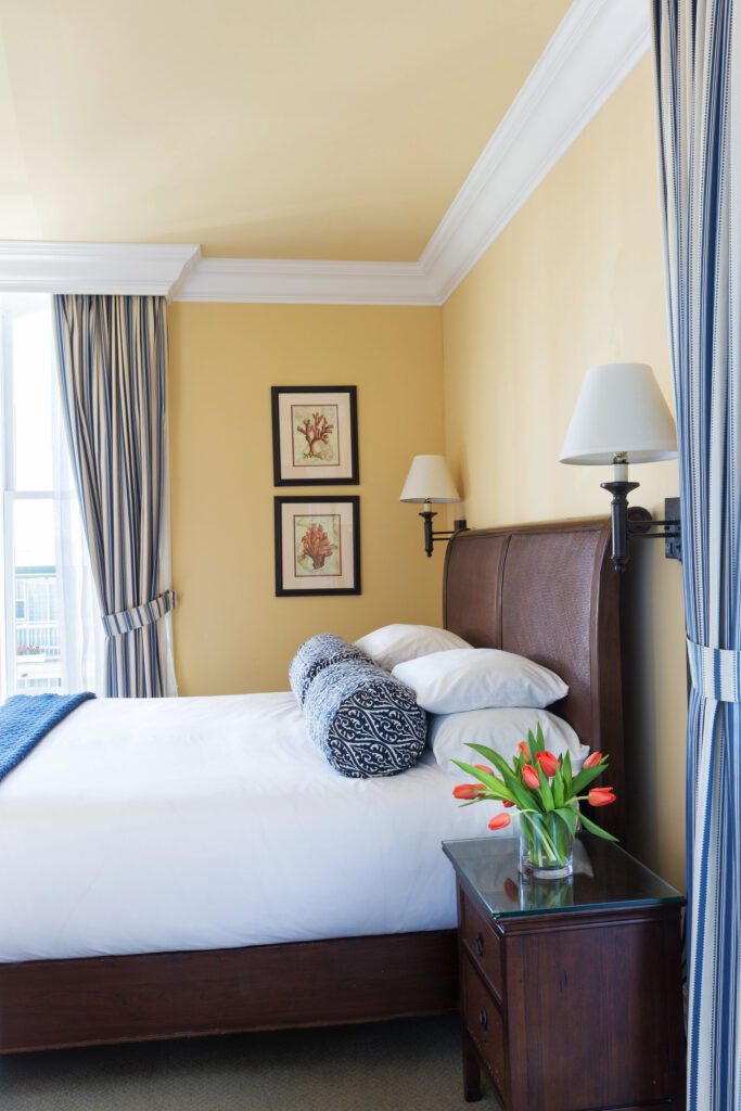 West Cliff Inn, part of the prestigious Four Sisters Inn’s collection, features a stately, three-story Italianate Victorian with its spacious, wraparound porch was completely renovated and features a breezy, coastal decor with fabrics in crisp blues and whites.